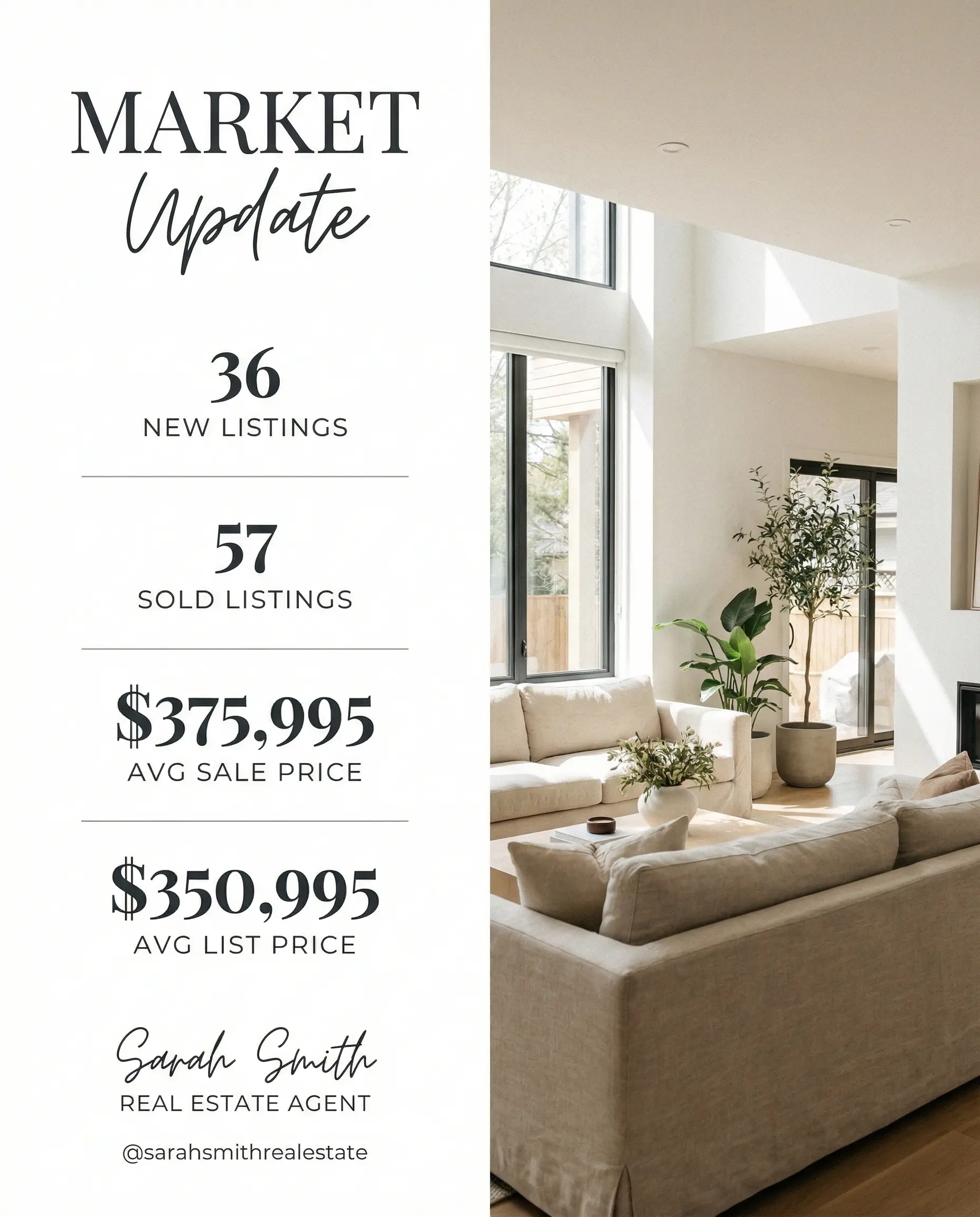 Market stats. Neighborhood guides. Homebuyer tips. Professional visuals in your brand colors.
